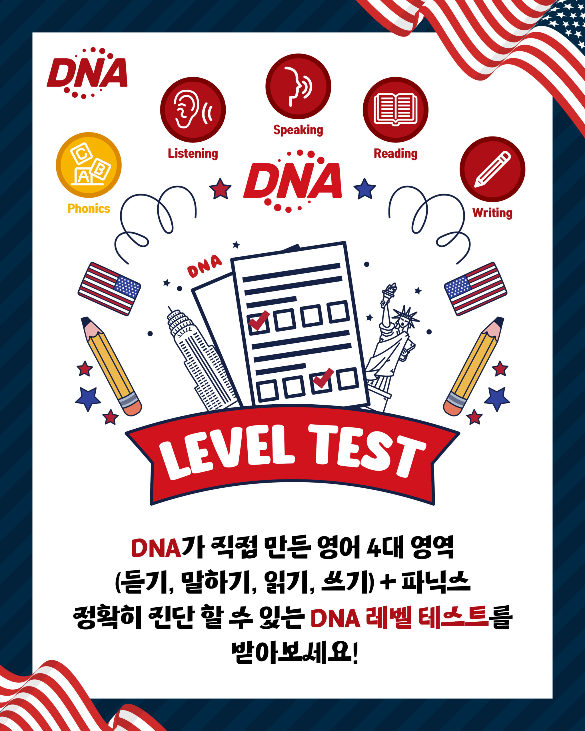 이 테스트는 DNA에서만 만나볼 수 있는 독점 자료입니다. DNA의 원장 Mr. Devin이 직접 고안하고 제작한 이 테스트는, 아이들이 실제로 영어로 ‘소통’할 수 있는 능력을 평가하기 위해 만들어졌습니다. 그는 이 테스트의 형식과 아이디어를 경쟁 학원들이 모방할 것이라 예상하고 있으며, 그 점에 대해 전혀 개의치 않습니다. 오히려 더 많은 아이들이 자신의 수준에 맞는 반에 배정되고, 더 많은 학원들이 아이들이 진짜로 사용할 수 있는 영어를 가르치는 데 집중하게 될 것이라 믿습니다. 듣기, 말하기, 읽기, 쓰기의 전 영역에서 문법적으로 올바른 문장을 완성하는 세심한 접근이야말로 아이들이 영어를 재미있고 자신 있게 배울 수 있는 길입니다.